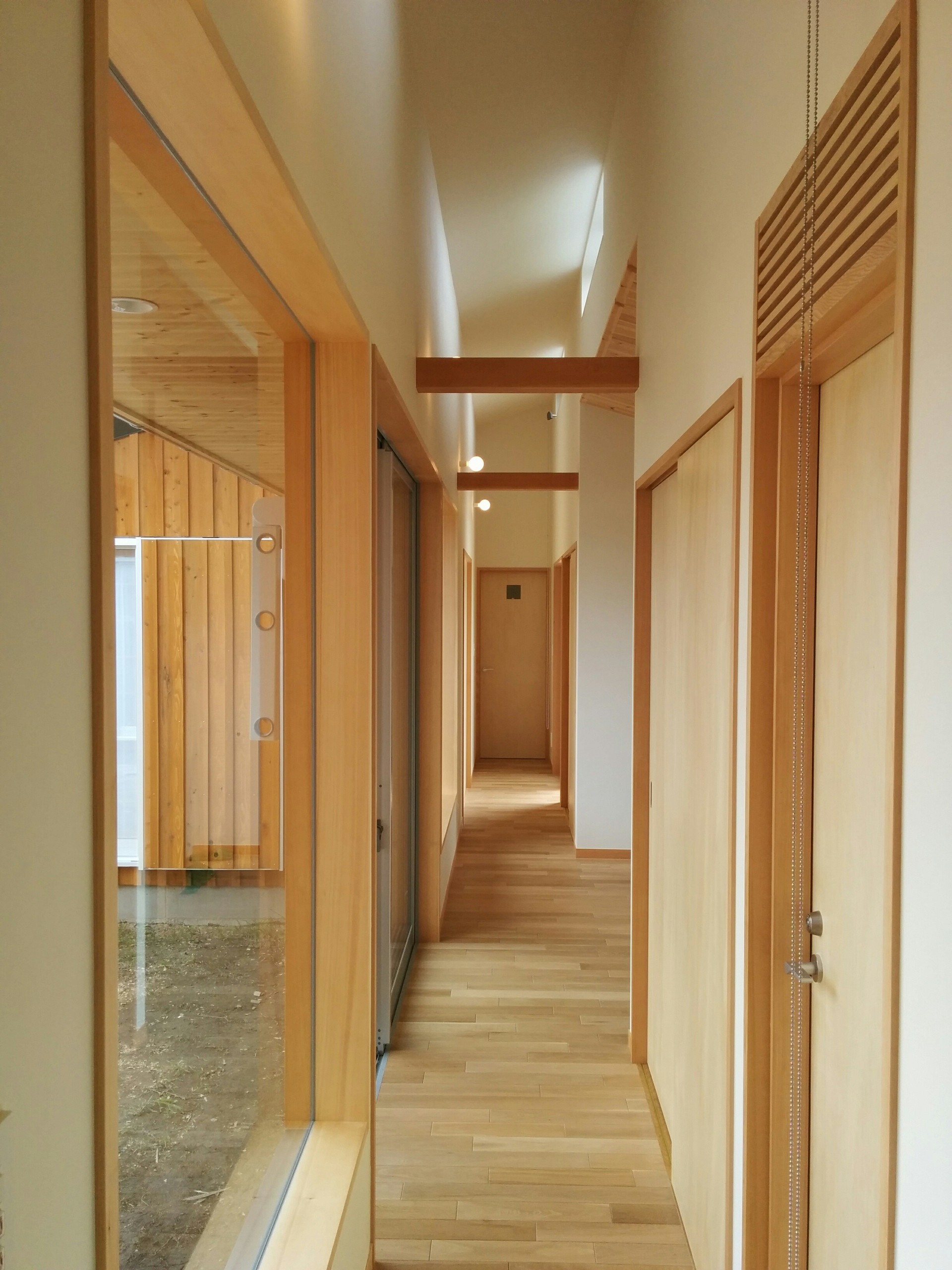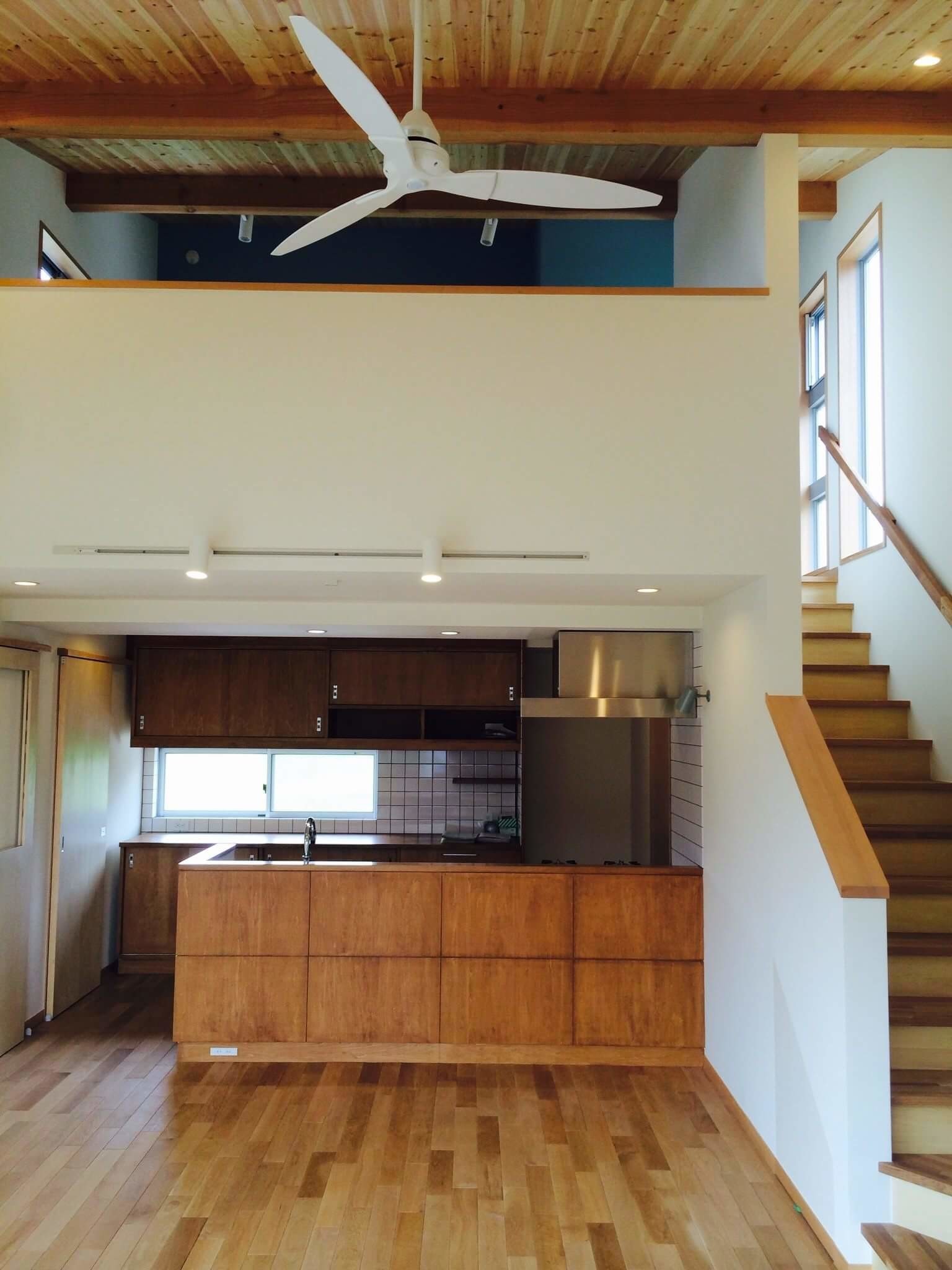 中庭(デッキ空間)を囲むように配置された空間はほぼ平屋となり(リビングにLOFTが有る)周りの風景に和むように計画されている。